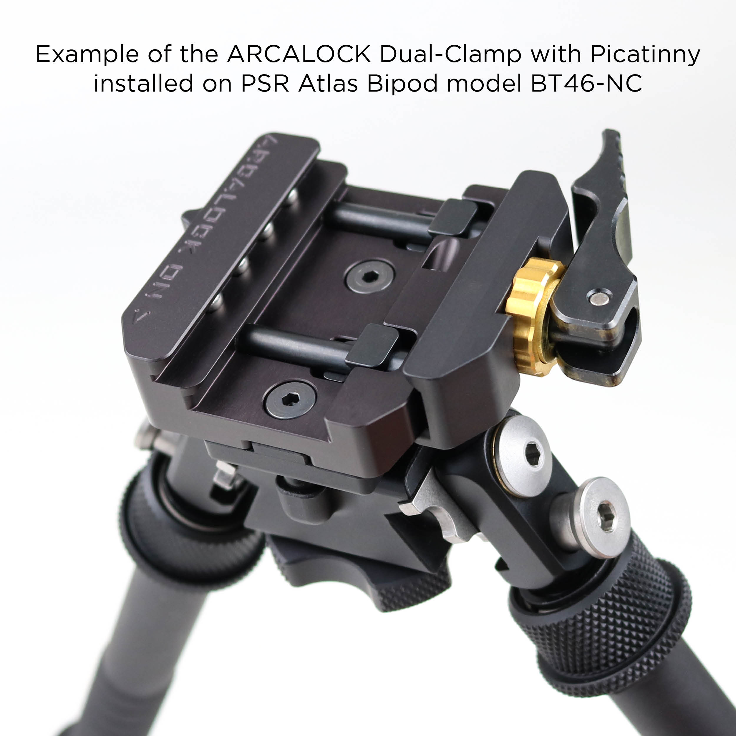 The ARCALOCK Dual Clamp works with Area 419 ARCALOCK Rail systems, ARCA rails from other manufacturers and Picatinny Rails with minimum of 4 slots. It will bolt directly to any “NC” (No Clamp) style of Atlas® Bipods (except the 5-H which requires Extension Spigot for compatibility). Compatible Atlas® Bipod models listed below.