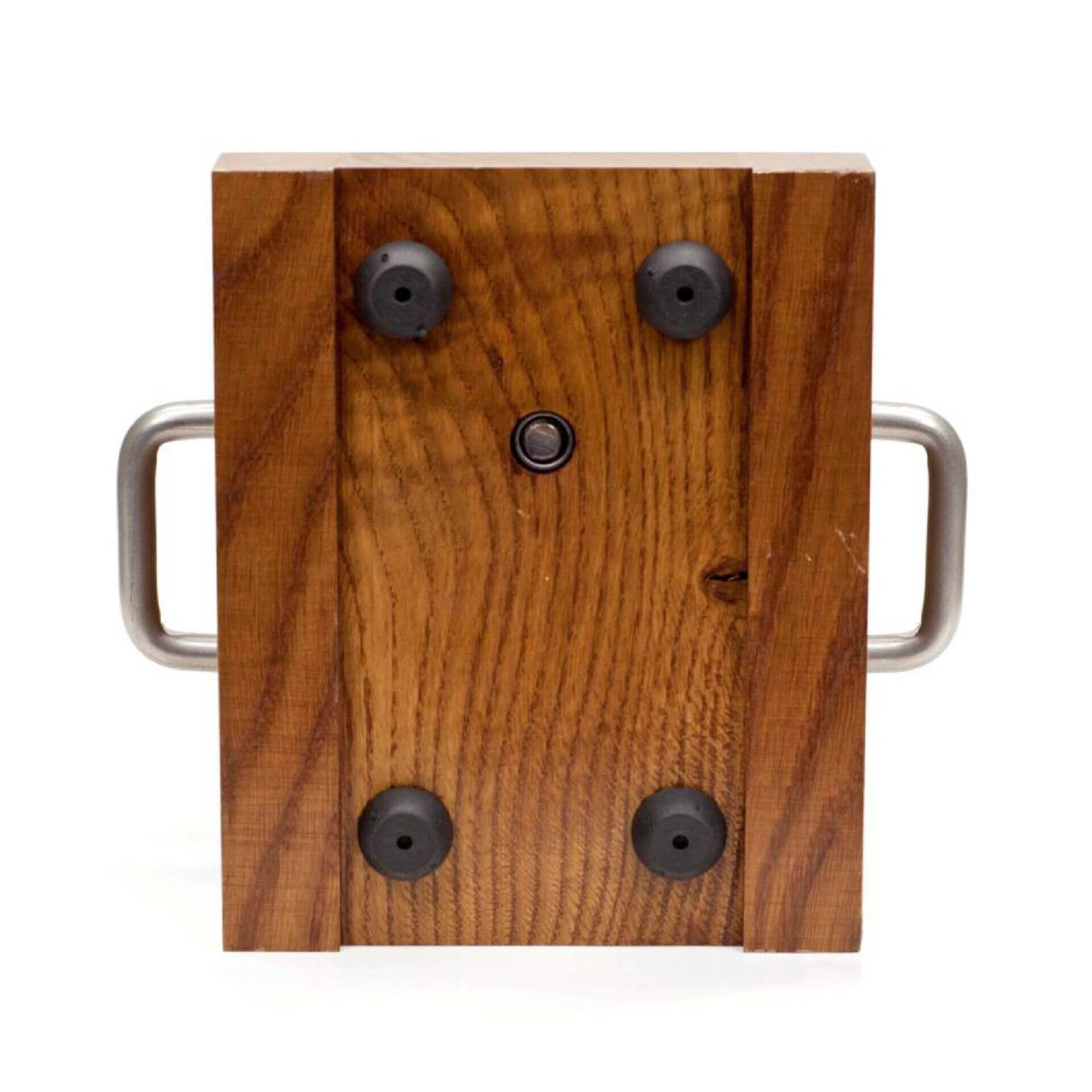 The Mortar model Base is quarter sawn American White Oak with the two Sides having a strengthening element bonding them to the Base Bottom. These joints are then reinforced with two ¼-20 Stainless Steel Button Head cap screws per side that in assembly pass through the Base Side, into the Base Bottom and terminate after threading into vertically located Bar Nuts having one end threaded for the standard rubber foot.