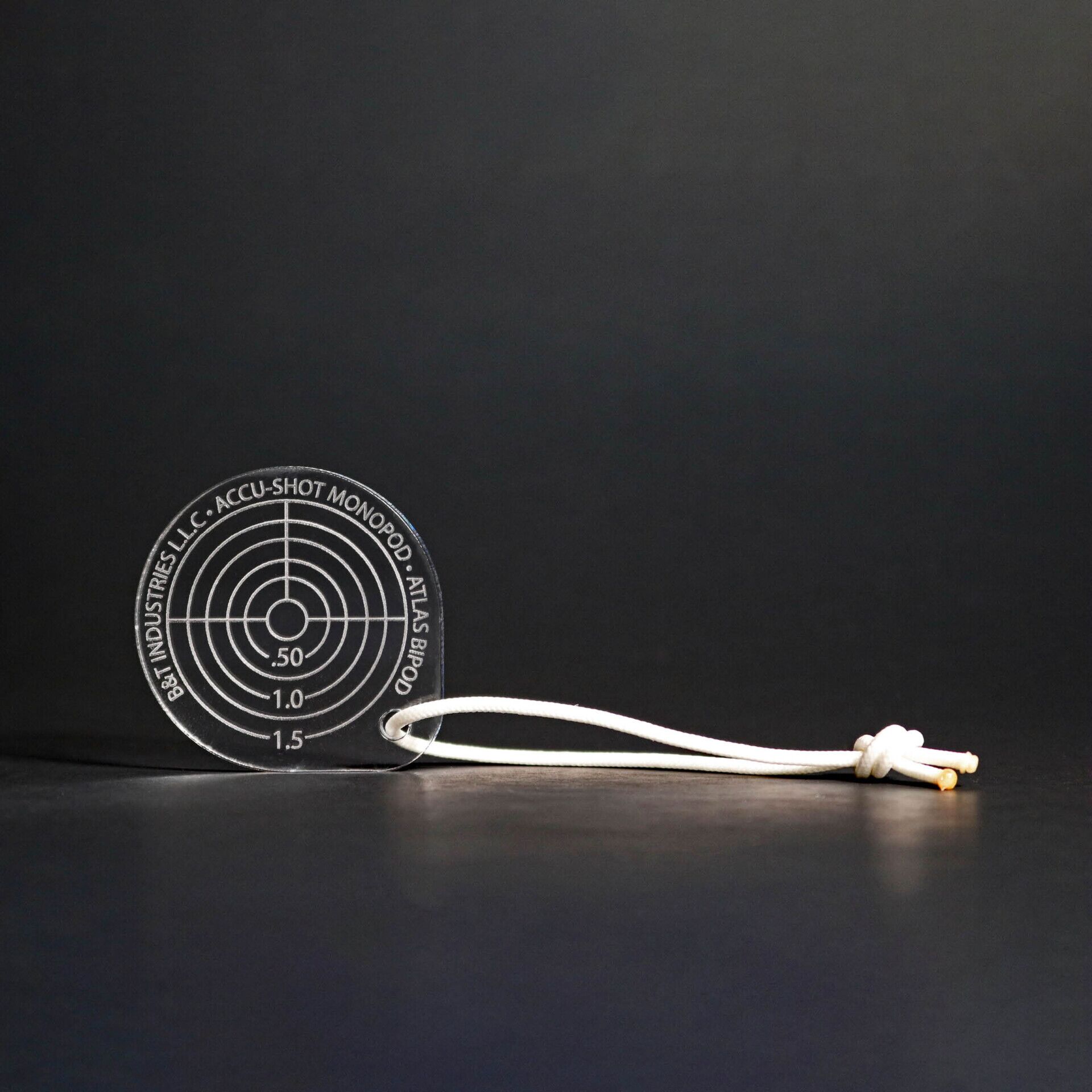The Groupy measures groups within a 1.5” diameter. Measurements are laser cut into acrylic with a glow-in-the-dark cord attached.