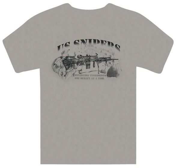 Sand Gildan 100% cotton T-shirt with line art on the back of a SF sniper in Fallujah with text, “Converting terrorist one bullet at a time.” Features 3” round US Snipers logo on front left chest. Line art measures about 14” wide and created by a young lady free hand from a photo supplied by a member of the Special Forces.